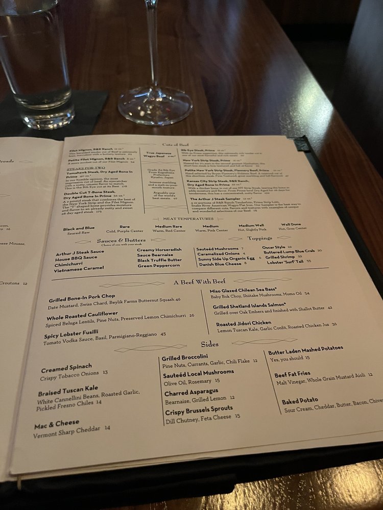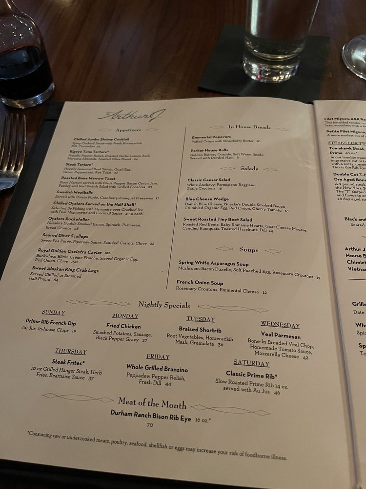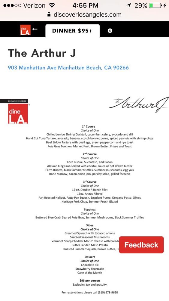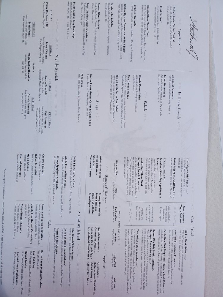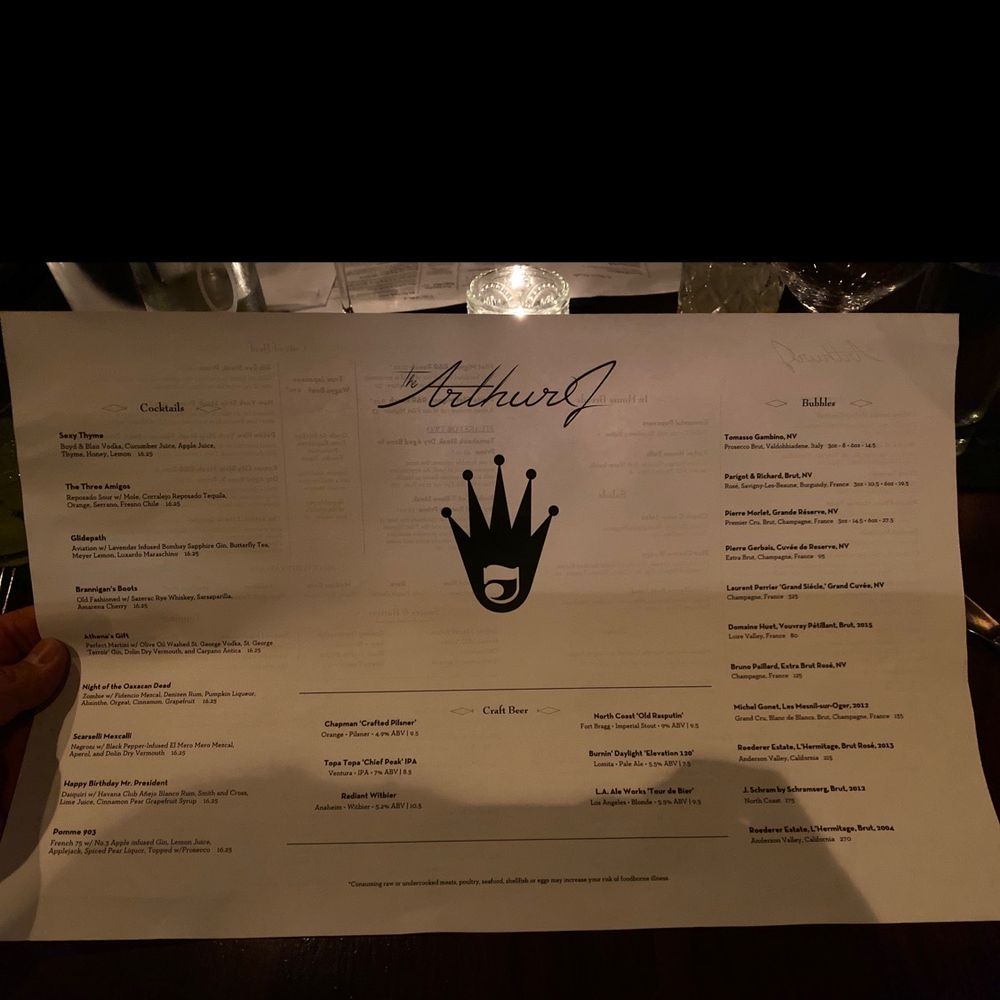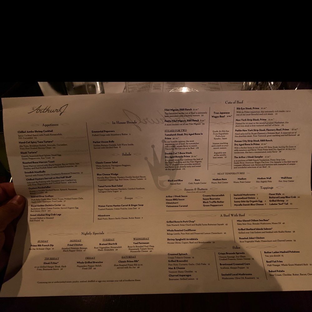 Introducing the menu at The Arthur J in Manhattan Beach, CA. This upscale restaurant offers a variety of starters like the Classic Caesar Salad and Handcut Salmon Tartare. Daily specials showcase dishes like the Arthur J Burger and Cumin & Coriander Roasted Halibut. For steak lovers, the A la Carte Grilled Steaks menu includes options like the 12 oz. R and R Ranch Filet Mignon and the Prime Dry Aged BoneIn Kansas City New York Strip. Customers rave about the perfectly cooked steaks, flavorful sides like mushroom and broccolini, and indulgent desserts like the ice cream sundae. The dark and bustling ambiance adds to the dining experience, making The Arthur J a must-visit for a special night out.